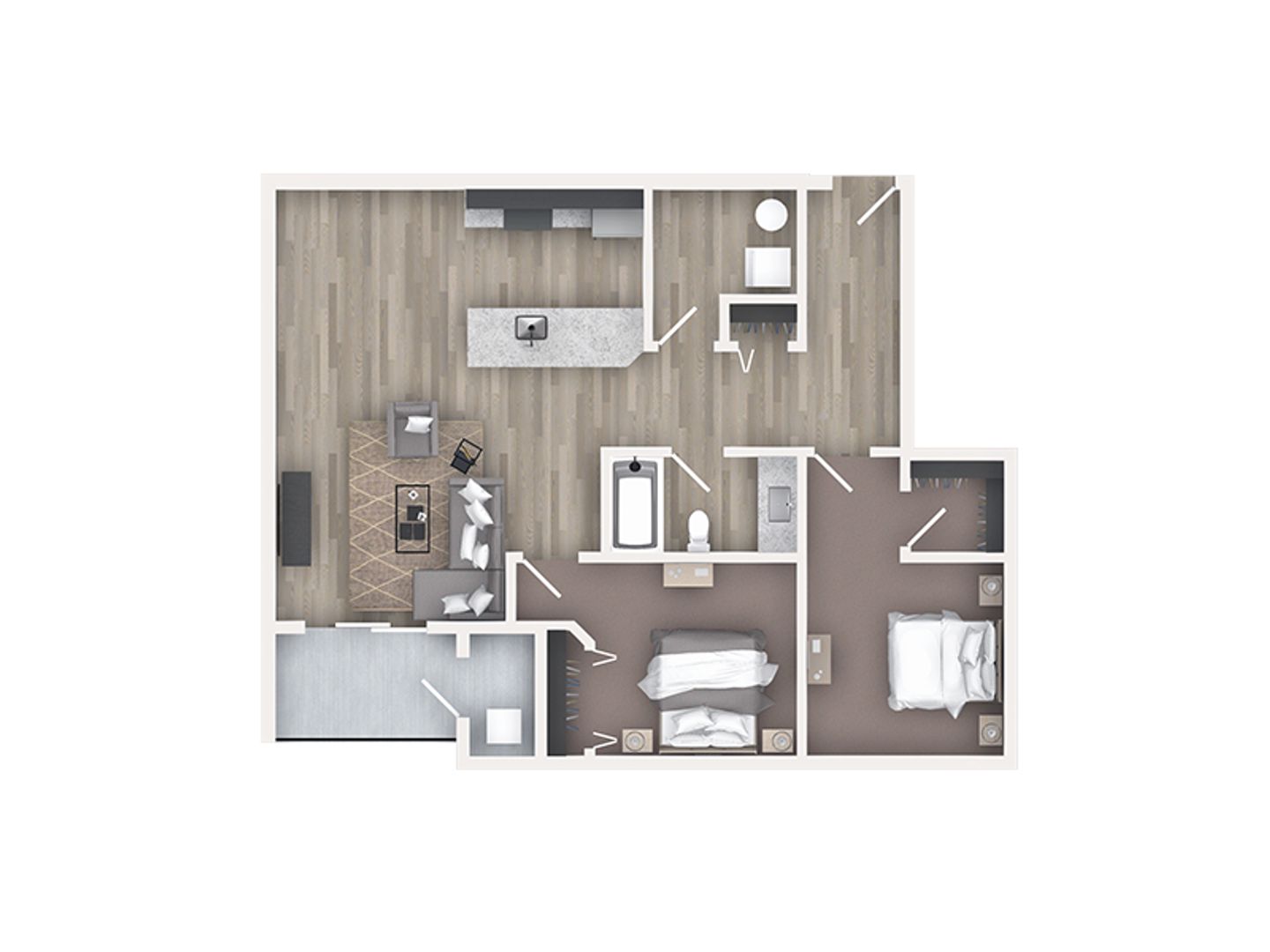 All apartment homes feature stylish granite countertops in both the kitchen and bathrooms, shiny stainless-steel appliances, and their own HVAC system for heating and cooling. Plus, you’ll love the window blinds for privacy! Each apartment also features spacious walk-in laundry rooms. This apartment includes laminate vinyl plank flooring in the common areas, with cozy carpet in the bedroom(s). The 2-bedroom, 1 bathroom layout includes a modern walk-in shower for added convenience and comfort. Conveniently located within walking distance of shops, grocery stores, restaurants, and bike trails.